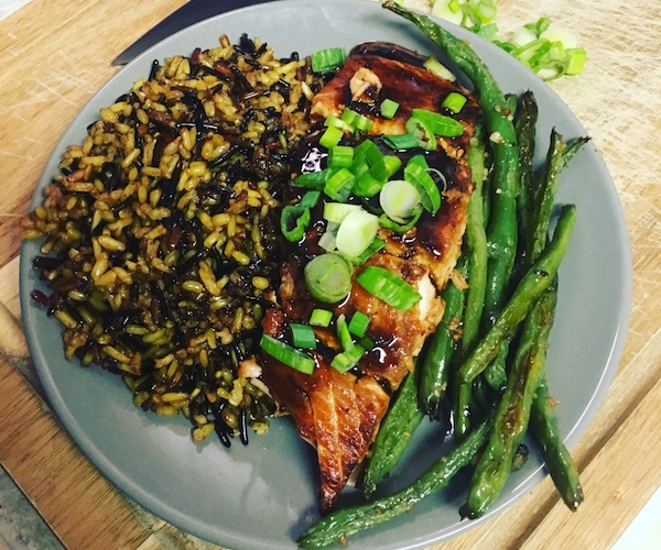 Soy Maple Glazed Salmon over Wild Rice & Asparagus