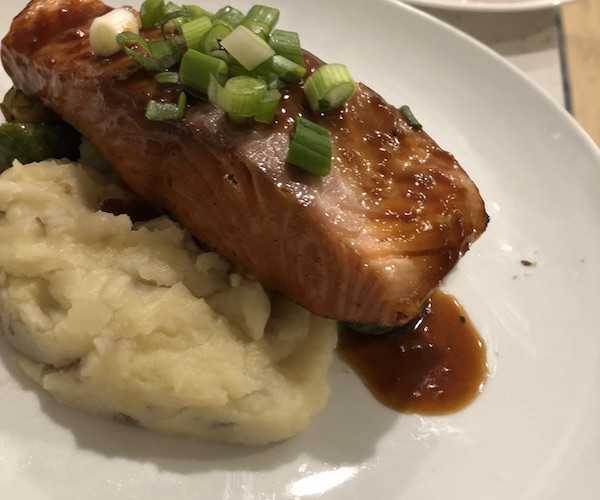 Soy Maple Glazed Salmon over White Cheddar Truffle Mashed Potatoes